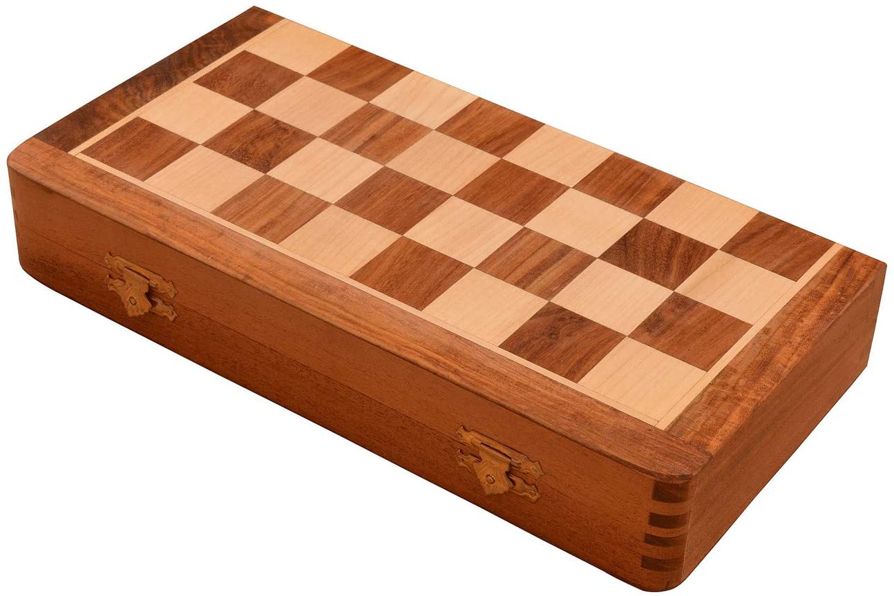 Chess Set: 14" x 7" x 2" Folded, Sheesham wood Inlaid with clasp closures.2-3/4" King, Sheesham wood weighted, green felted.