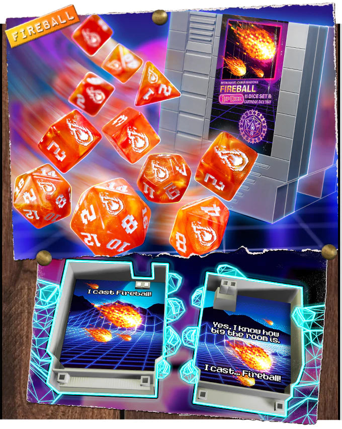 Fueled by '80s video games, steroids and 1.21 gigawatts of pixelated power; these 8-bit themed 1UP-Dice are stylin' and profilin' for all you retro-radical rollers! These mathematical click-clacks are great for tabletop role-playing games and for enhancing your favorite board games. This set features the Fireball from our Retrowave Cybermagicka series.