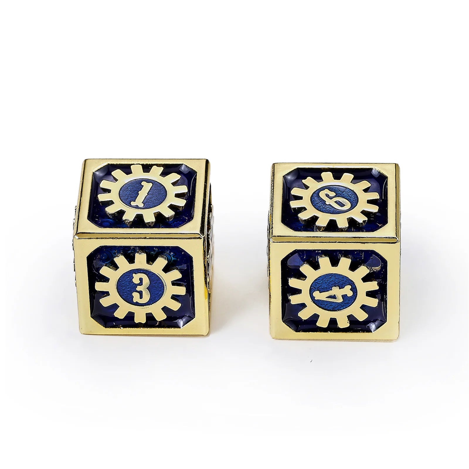 Each side of these solid metal six sided dice is emblazoned with a number centered in the middle of a spinning cog. These standard sized D6 come as a pair and are packaged in a sturdy box with a foam insert.