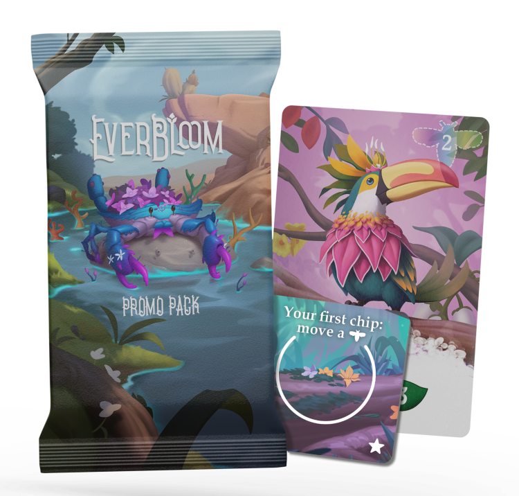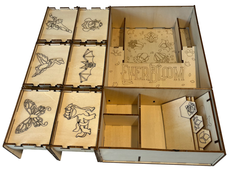 In Everbloom, lead one of six pollinating factions: Bats, Bees, Butterflies, Hummingbirds, Lemurs, and Lizards to create an abundant habitat full of hybrid beings. Each round you'll send pollinators from your faction into the wilderness to landmarks in the hopes of attract hybrid beings to your habitat, eventually pollinating their flora in exchange for nectar and points. Along the way, you’ll complete blooms and gather nectar cards to make sure your habitat flourishes. After the final round, you will gain points for the nectar you've collected in each biome as well as your progress on the bloom track, the faction with the most points wins!
