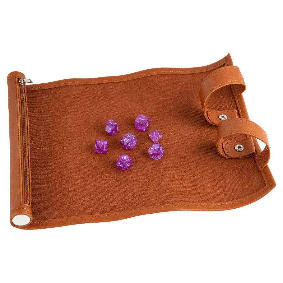 FanRoll's scroll rolling map appears to be a rolled up leather scroll, but unwinds into a soft rolling mat for your dice. The secret zipper compartment holds all your favorite dice.