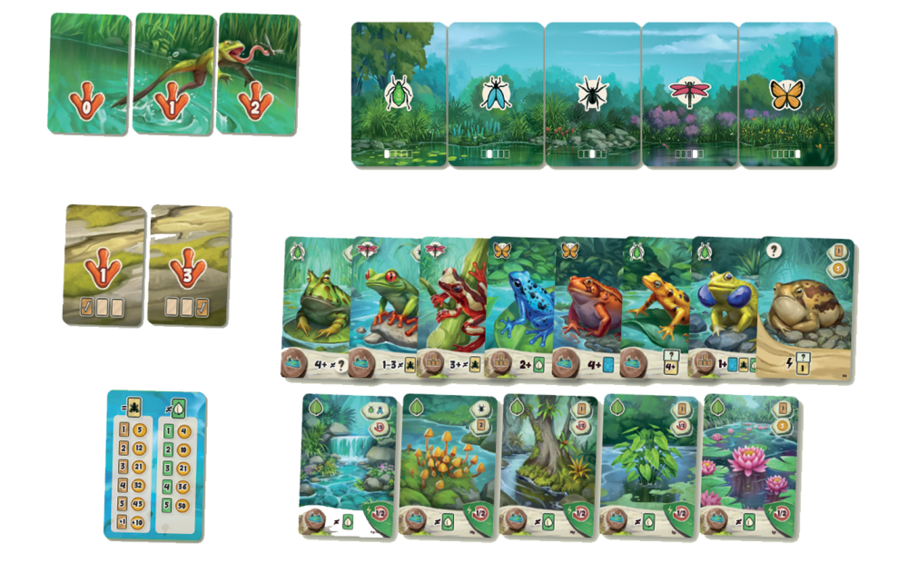 A unique shared mechanism revolves around the "jumper frog", a central figure that hunts insects and other food. All players influence the jumper frog's actions and compete to gather insects that can provide bonus points during the final scoring. Careful planning and resourceful play will lead to the most balanced and flourishing pond!