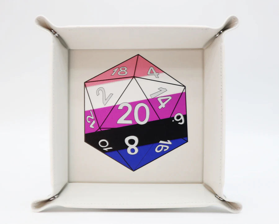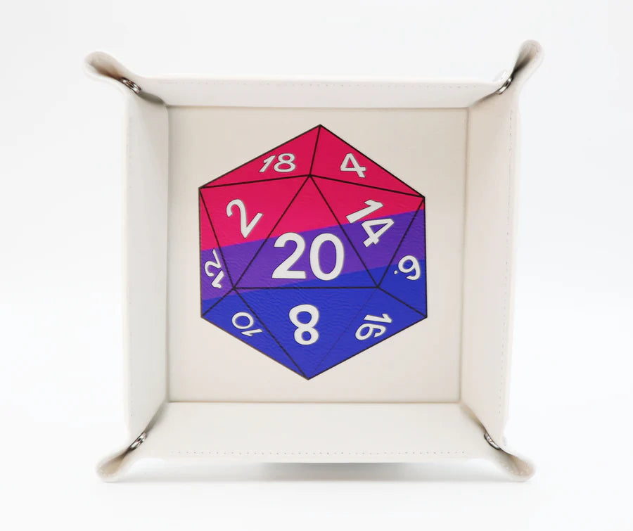 Show your pride with our collapsible dice tray! This dice tray is made with durable leatherette and strong metal snap buttons. It's perfect for the traveling player or Dungeon Master. The tray stays flat and snaps together when you're ready to play!