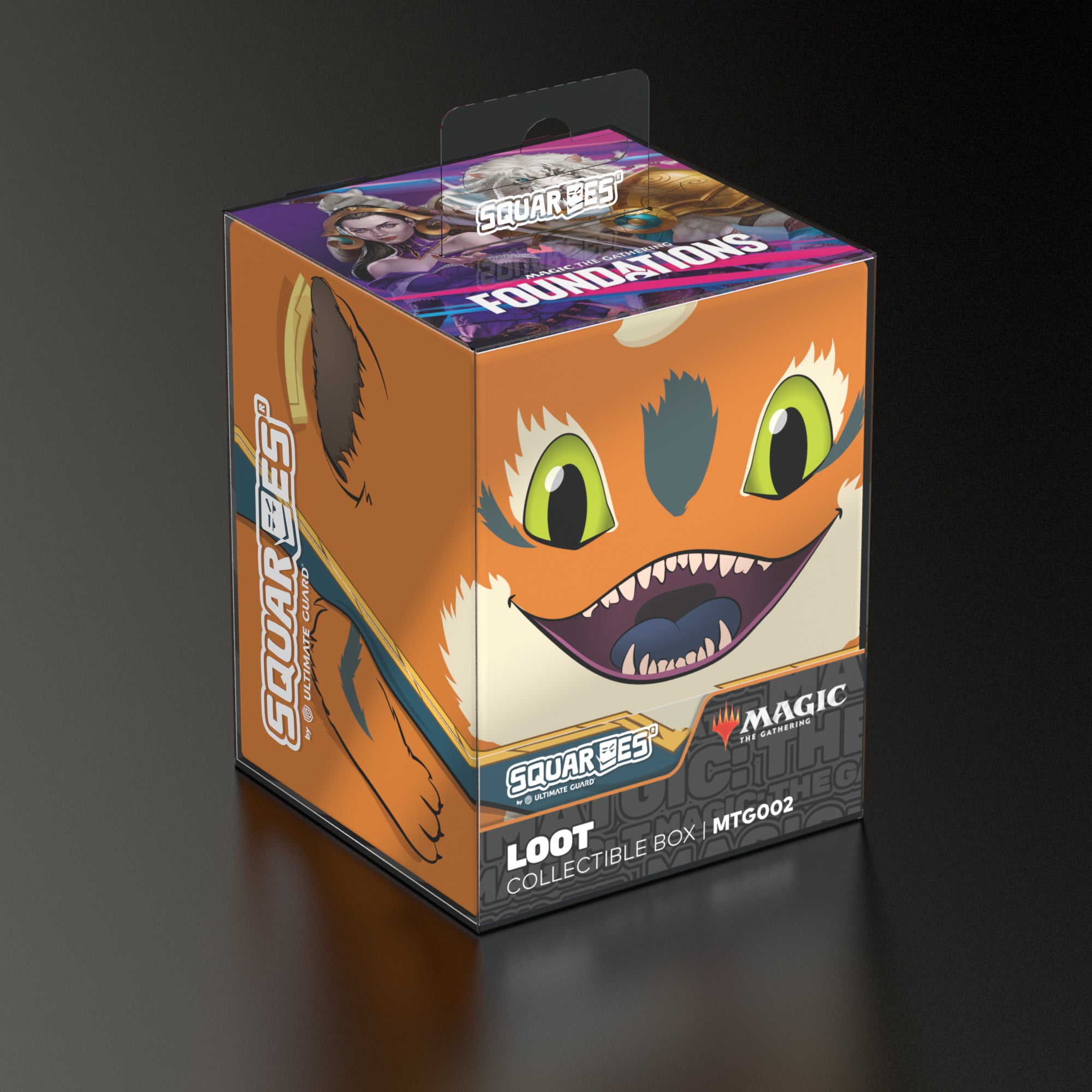 Collectible box for storing your deck, tabletop gaming accessories, and/or collectibles. The Loot Squaroe from the Magic: The Gathering Foundations edition holds up to 100 cards in double protective sleeves if used as a deck box. Squaroes are made from 78% renewable resources.