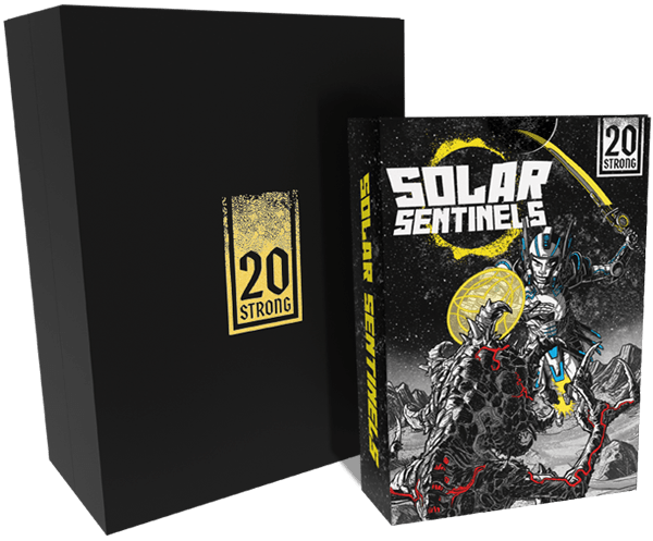 20 Strong is a new deck-based game system from Chip Theory Games, capable of being played in about 30 minutes or less. We say “game system” because the idea behind 20 Strong is a small nucleus of simple, adaptable rules that can then be applied to a variety of unique decks, each with their own set of mechanics. We are launching 20 Strong with three such decks – one set in the world of Too Many Bones, one set in Hoplomachus: Victorum, and one in the new universe of the space-faring Solar Sentinels. We have more decks in development and plan to release them regularly if our customers are excited by them. For now, 20 Strong is a solo-only game, but even that could differ in future decks using the ruleset.