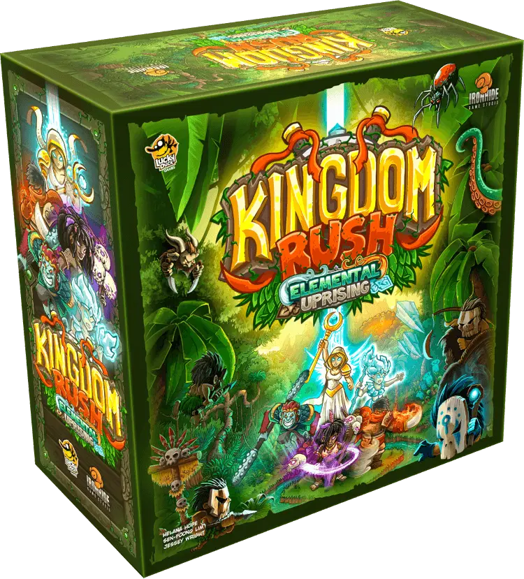 Kingdom Rush: Elemental Uprising is a fully cooperative standalone board game for 1 to 4 players that offers the ultimate tower-defense experience for the tabletop. Players take on the roles of asymmetrical heroes defending their kingdom against waves of incoming monster hordes. Players play towers to attack hordes, using polyomino tiles to cover monsters until all monsters in a horde are covered, destroying it. Players will earn crystals and gold which can be spent on buying new towers or Tower Modifications to improve and customize their existing towers.
