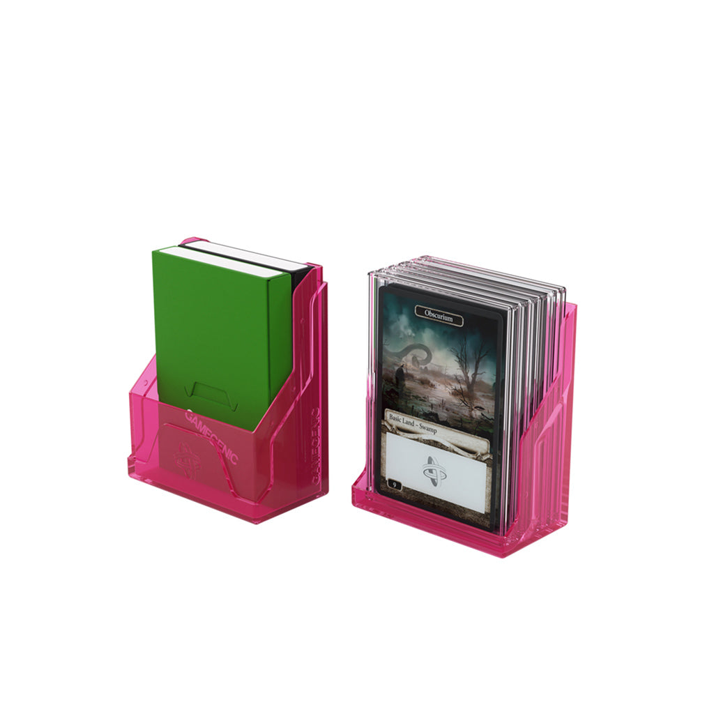 The Bastion 50+ is a very compact and rock-solid deck box to safely protect up to 45 double sleeved cards in Thick Inner Sleeves. It is ideal for decks with 55+ double sleeved cards in standard inner sleeves and also holds Mini Snap and Slide Card Cases as well as Cube Pockets. Due to translucent materials and smart positioning of the closing flaps, the top card is fully visible from the outside without opening the box. The innovative secure click-lock mechanism protects your deck while still allowing easy access. The Bastion consists of 2 symmetrical parts that easily convert into a card pile and discard pile holder. It is perfect for a huge variety of trading card games.