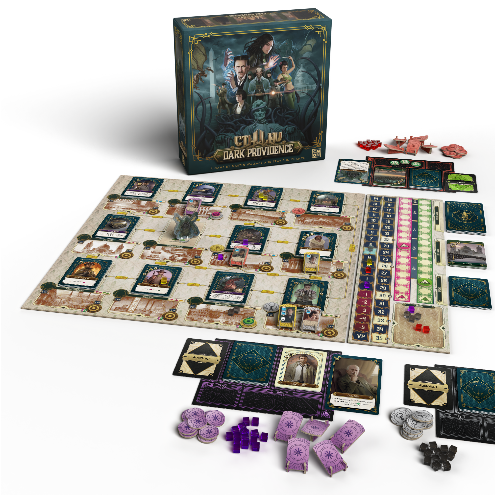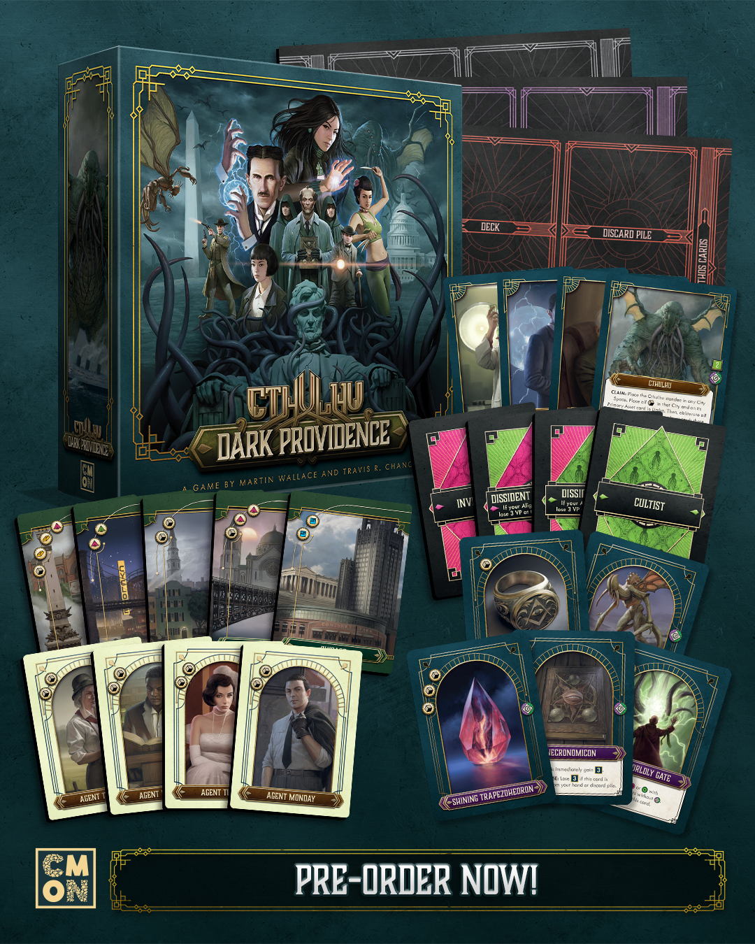 Cthulhu: Dark Providence is a new take on Martin Wallace’s A Study in Emerald, which combines deck building mechanics, secret agendas, and the works of H.P. Lovecraft. As the Great Depression rages, cultists look to work their influence on the United States, twisting it into a nightmare version while Investigators are working to stop them.