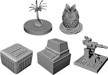 High-quality hard plastic 30mm scale miniatures, representing iconic elements from the 1986 film ALIENS. Perfect for painters and collectors, or to enhance your table-top roleplaying experience. Includes two plastic sprues to build: 2x Facehuggers, 8x Eggs, 2x Sentry Guns, 6x Computer Terminals and 16x Crates.