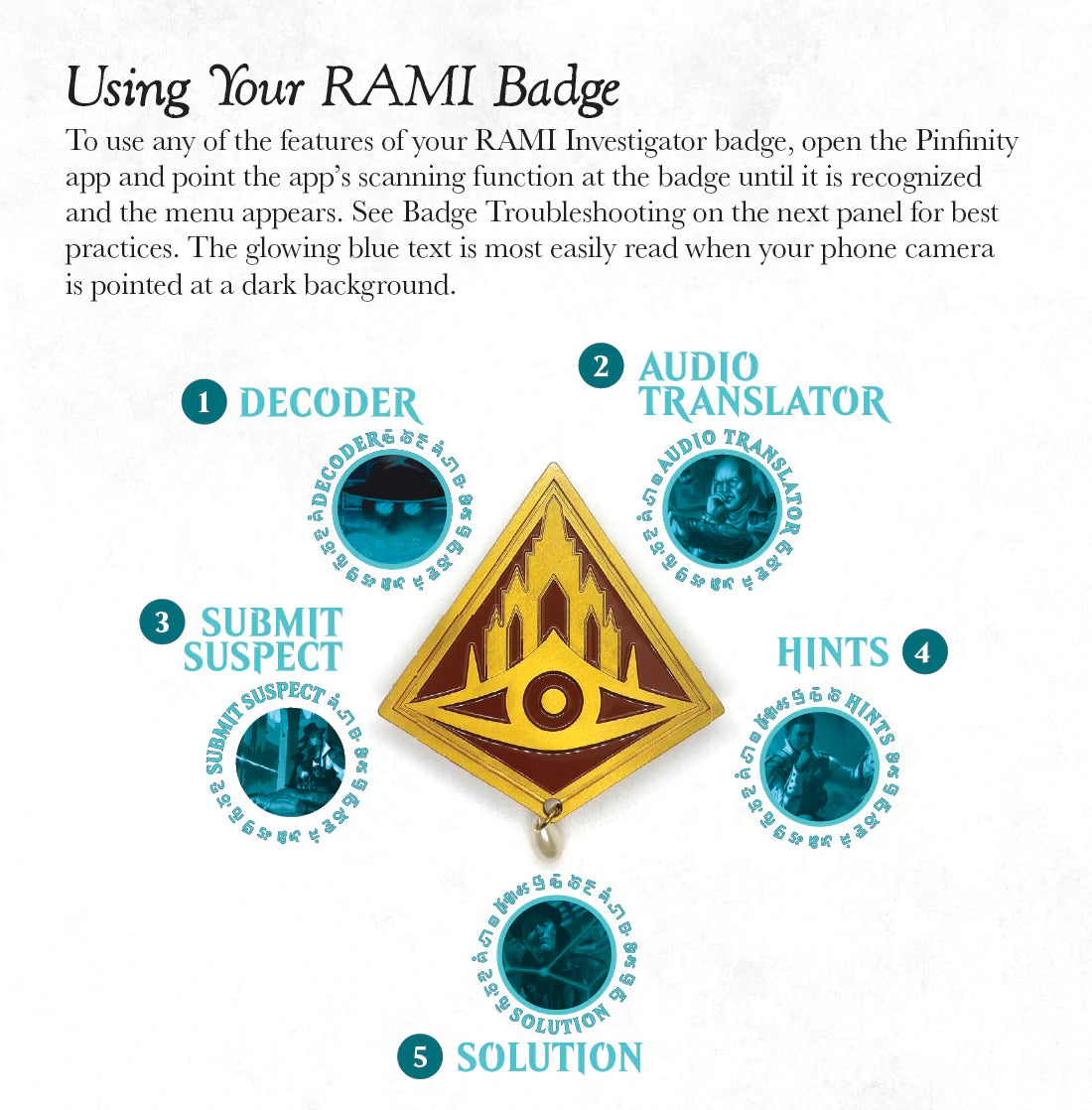 Pore through Lead Inspector Tam Sennic’s evidence and use the augmented reality embedded in your Ravnican Agency of Magicological Investigations (RAMI) badge (3" x 3" by Pinfinity) to identify suspects and bring a killer to justice!
