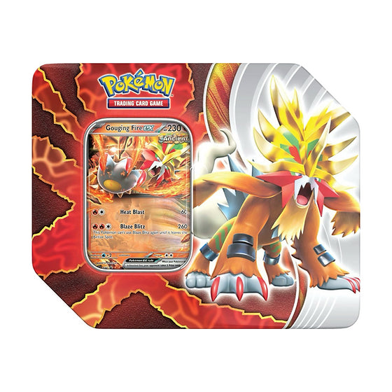 More Paradox Pokémon from the past and future arrive in the Pokémon TCG for a destined battle surpassing time itself! The Ancient Pokémon Gouging Fire ex and Raging Bolt ex show their primordial prowess, while the Future Pokémon Iron Boulder ex and Iron Crown ex demonstrate metallic mastery. In this Paradox Destinies Tin, you’ll find a promo card featuring one of these four Paradox Pokémon, additional allies to add to the fray with 5 booster packs, and a code card for Pokémon TCG Live.