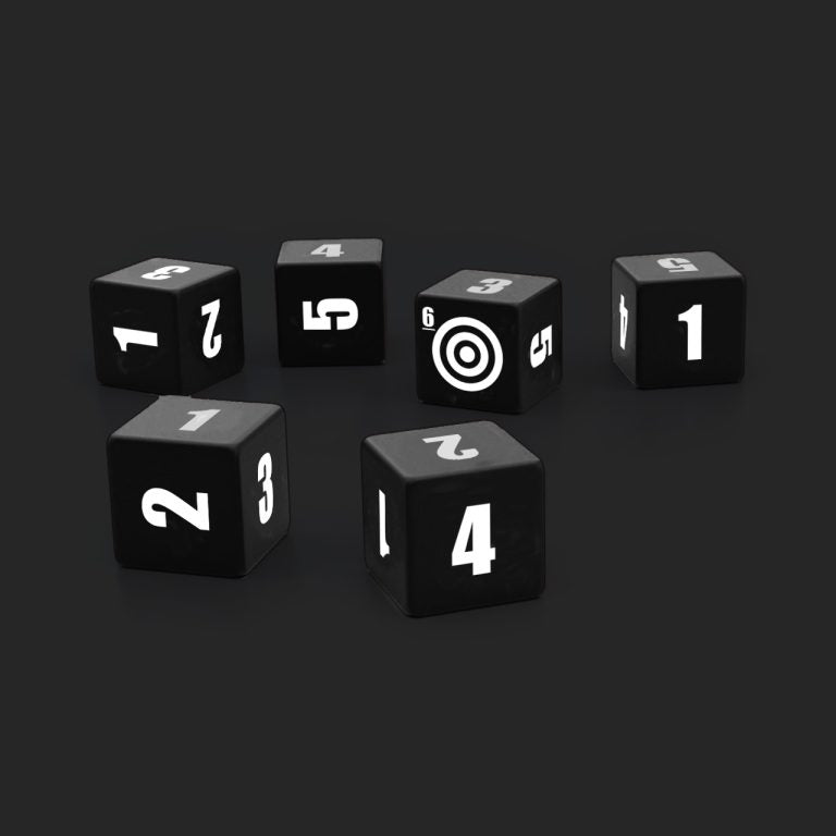 A set of 10 engraved dice, made specifically for The Walking Dead Universe Roleplaying Game. These 16 mm special dice are designed to support the game mechanics but can be used as normal six-sided dice as well.