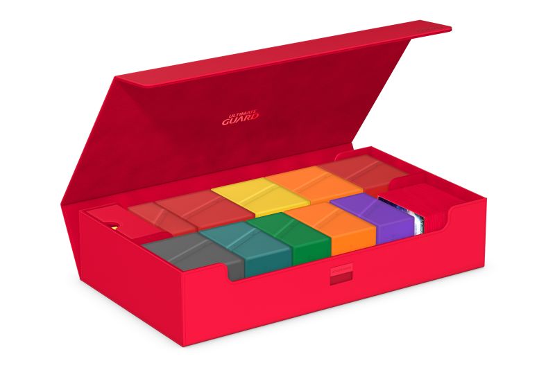 The ultimate spacious and flexible box for storing large collections. This box can hold more than 1000 double-sleeved cards or carry multiple decks and/or Play-Mats plus other Ultimate Guard products like the Sidewinder 133+. Two removable, magnetic, adjustable and stackable trays make this box unique: it’s adaptable for all kinds of games and formats and enables multiple different ways of storing and using your collection.