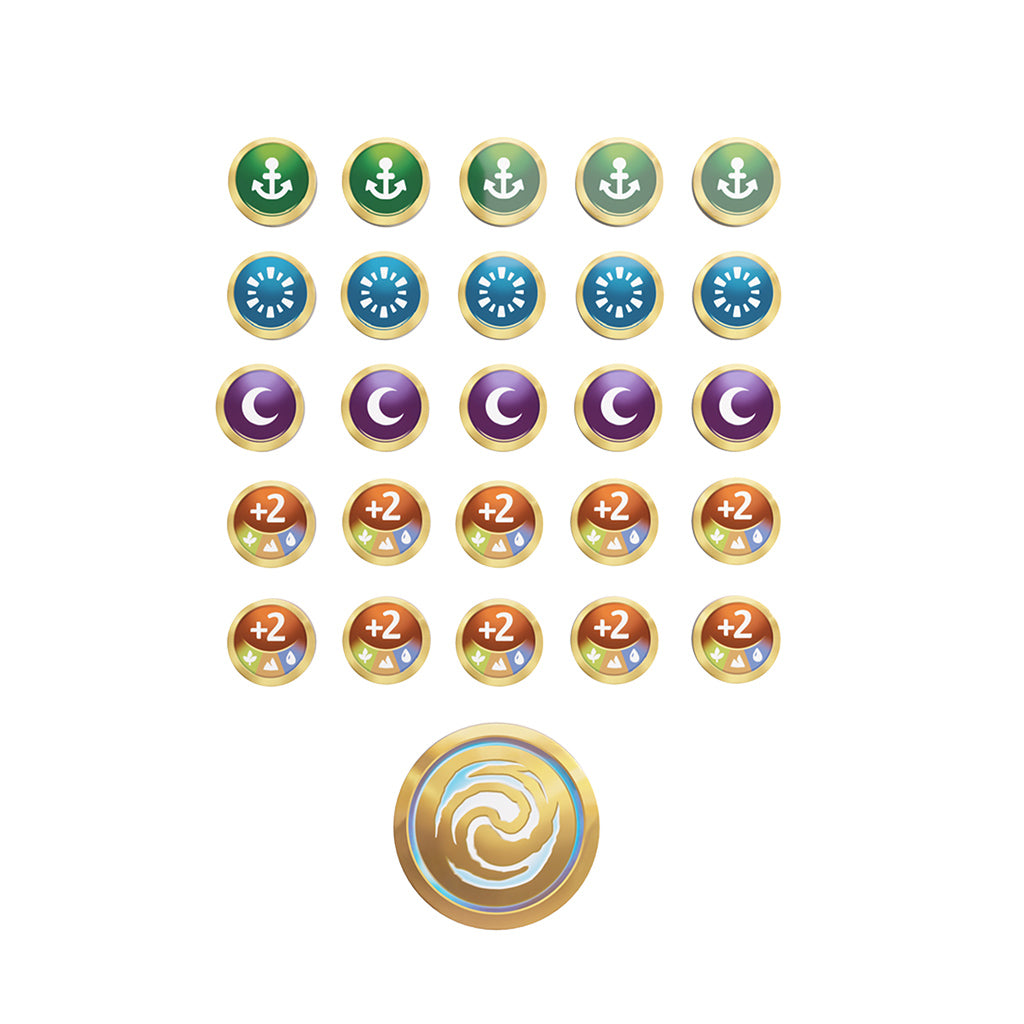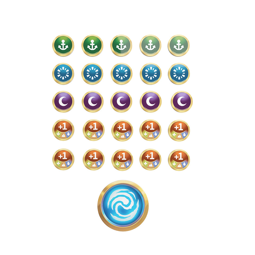 One marker set comes with 26 individual pieces, more than in the original game. Including: 1x First Player marker, 5x Anchored marker, 5x Fleeting marker, 5x Asleep marker, and 10x double-sided Boost marker (+1/+2).