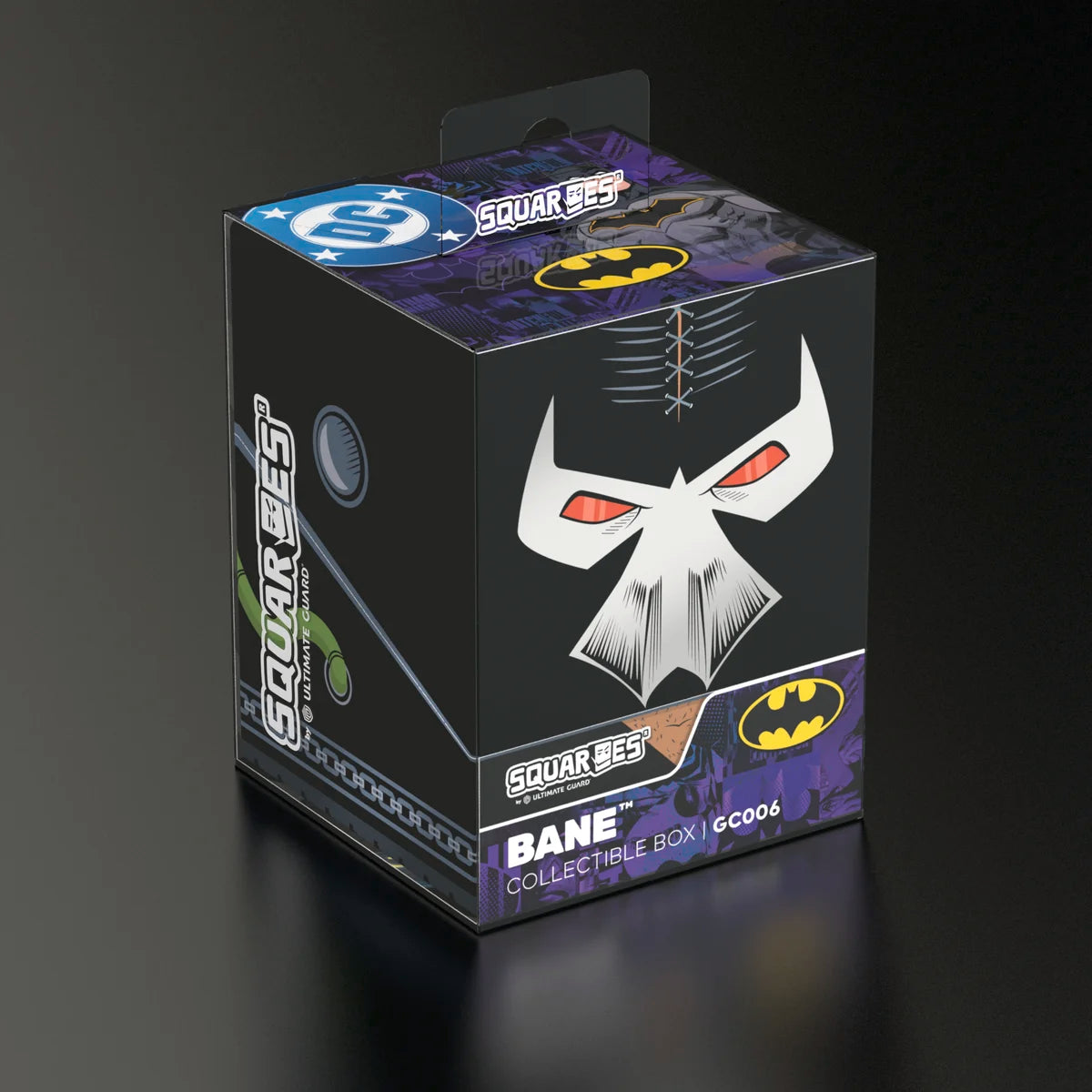Collectible box for storing TCG decks, tabletop gaming accessories, and/or collectibles. The Bane Squaroe from the Batman: Gotham City edition holds up to 100 cards in double protective sleeves if used as a deck box. Squaroes are made from 78% renewable resources and fit perfectly into the separately available Collectors Case.