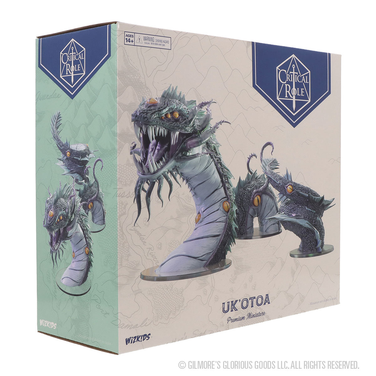 Fresh off its debut during The Mighty Nein Reunited special, Critical Role: Uk’otoa brings a version of the tabletop miniature directly to your collection! This gargantuan miniature features 3 pieces; head, midsection, and tail, all on their own bases that can be posed or positioned all over the battlefield as the rest of the impossibly long serpent coils beneath the waves. The head, bearing down on its prey, or rewarding those that set it free, stands nearly 5 inches tall. The massive tail curves out of the water, looking to drag someone below, and can hold 1 unlucky medium creature on a 25mm base.