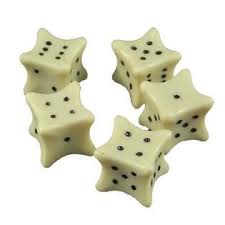 These 18mm 'Bone' dice are numbered one to six with traditional dice pips, spots, etched into the surface of the dice and painted black. Use these unique dice to play your favorite dice and board games or create your own game. The 6 dice come enclosed in a plastic resealable bag which can be used for storage and travel. Dice are plastic (these dice are not made of real bone - they are named such because of their look and style).
