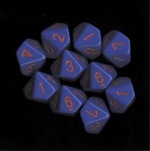 Set of 10d10 opaque purple dice with red numbering. This set of ten-sided dice is ideal for any World of Darkness game, from Vampire, Werewolf and Mage to Changeling and Aberrant. This dice set is standard-sized 16mm dice.