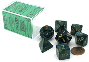 This Chessex dice set is simple and easy to read scarab jade with gold numbering. Great for people beginning a die collection or just looking for a new dice set to increase their rolling options.