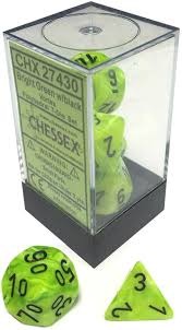 This Chessex dice set is simple and easy to read vortex bright green with black numbering. Great for people beginning a die collection or just looking for a new dice set to increase their rolling options.