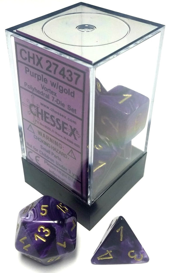 This Chessex dice set is simple and easy to read vortex purple with gold numbering. Great for people beginning a die collection or just looking for a new dice set to increase their rolling options.