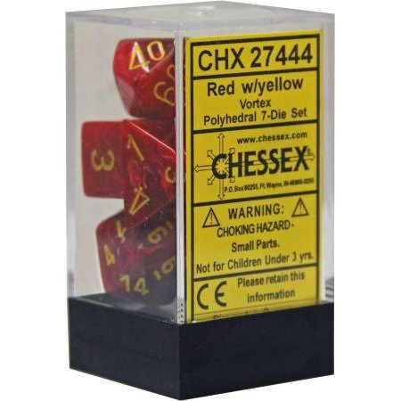 This Chessex dice set is simple and easy to read vortex red with yellow numbering. Great for people beginning a die collection or just looking for a new dice set to increase their rolling options.