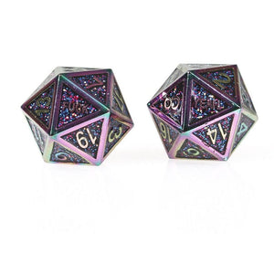 This heavy duty set of 2 polyhedral D20 die are made of solid METAL with a silver and black, blue or purple enamel finish that will stand up to years of heavy use.