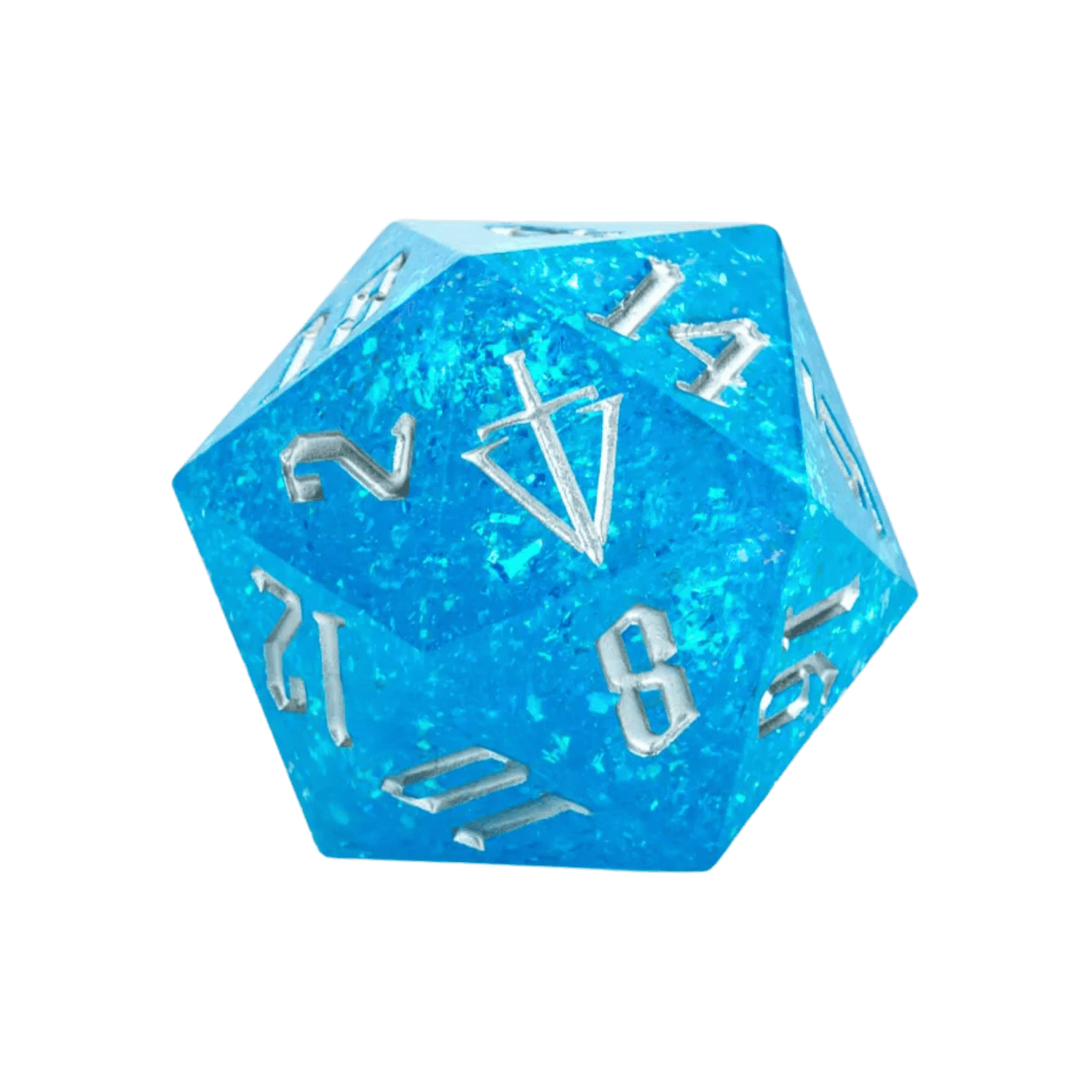 Upgrade your gaming experience with the Tales of the Valiant collection! Roll with confidence! At 35mm, this mega acrylic d20 will add some authority to your gaming table. One thing is for sure, you will never struggle to read the numbers on this huge dice! These D20s are swirled with gorgeous colours.