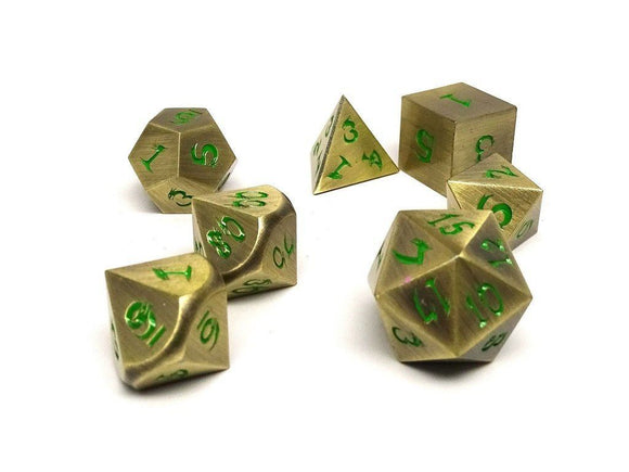 "This set features our Ancient Bronze finish with a green font. The numbering is our unique Dragon Font that is a one-of-a-kind design which is only being utilized on Metal Dice of Ancient Dragons Series.