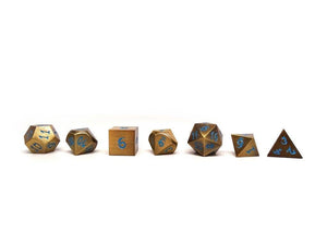 "This set features our Ancient Gold finish with a powder bluefont. The numbering is our unique Dragon Font that is a one-of-a-kind design which is only being utilized on Metal Dice of Ancient Dragons Series.