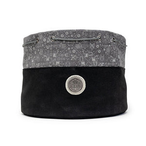 This version of Bailey's Dice Bag of Hoarding features gray canvas with patterned icons inspired by the Vox Machina and Mighty Nein campaigns and black suede.