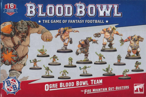 This multipart plastic kit contains all the components you'll need to build the Fire Mountain Gut Busters, an Ogre team for use in games of Blood Bowl, containing 4 Ogres (1 of which can be built as a Runt Punter), and 12 Gnoblars with interchangeable heads! You'll also find a roster sheet, transfers, 2 turn counters and 2 coins, 4 Ogre-themed balls, and a mix of 14x 25mm Citadel Round bases and 4x 32mm Citadel Round Blood Bowl bases.