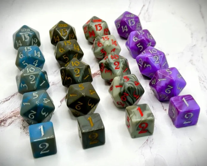 - 4 Custom 25mm spindown d20s and 1d6 in matching color