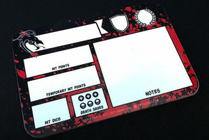 Remembering all your character specs and keeping them up to date can get tricky, especially when they keep changing during a fight! The Player Dry-Erase board has everything you need to track your damage, death saves or wounds, and other notes. It's specifically designed to streamline combat and quickly provide relevant information. Change it as many times as you need in your encounters. Level up your gameplay with the Player Dry-Erase Board!