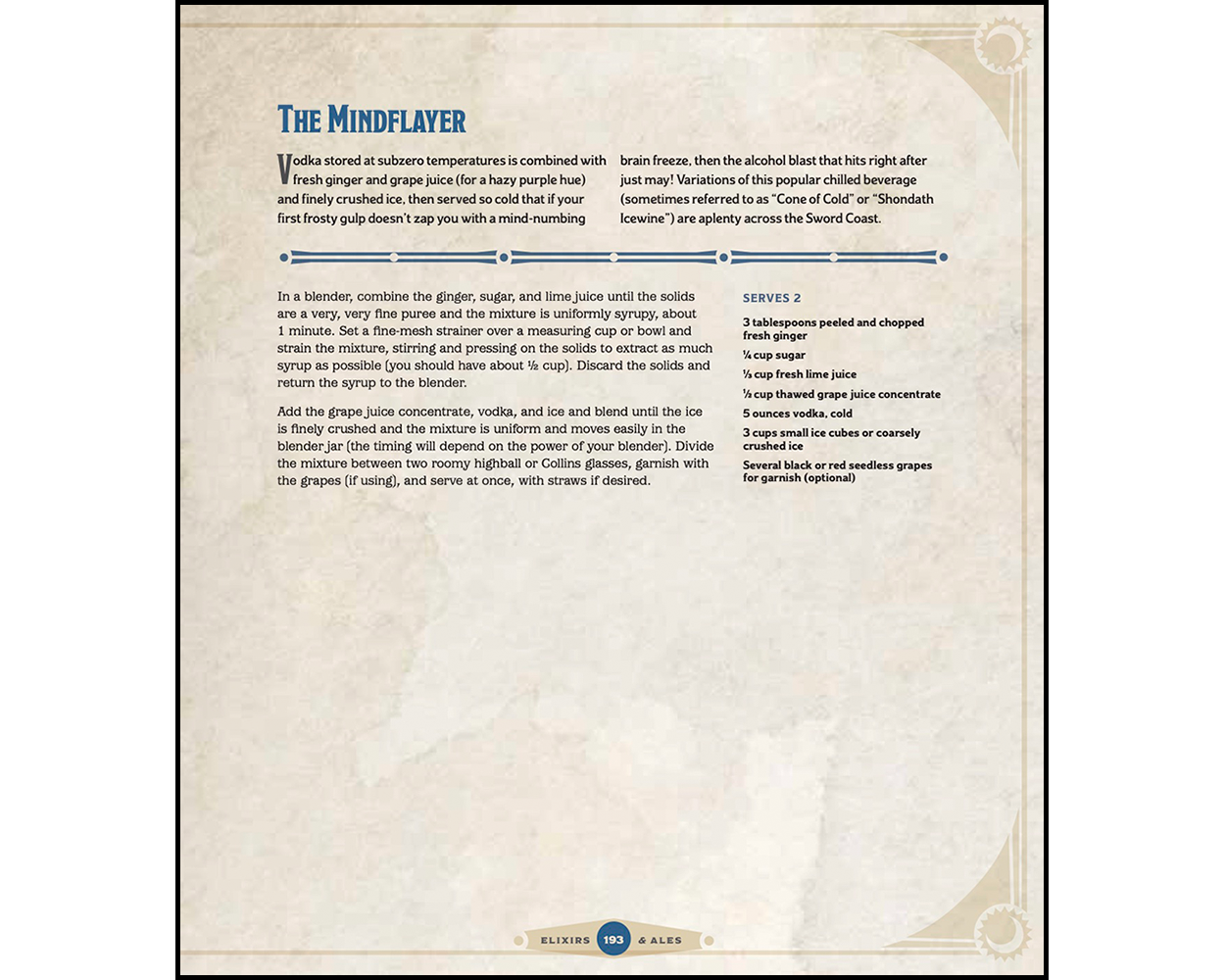 80 recipes inspired by the magical world of Dungeons & Dragons—perfect for a solo quest or a feast shared with fellow adventurers. From the D&D experts behind Dungeons & Dragons Art & Arcana comes a cookbook that invites fantasy lovers to learn about their favorite fictional cultures through their unique cuisines and lifestyles. With this book, you can prepare dishes delicate enough to dine like elves and their drow cousins or hearty enough to feast like a dwarven clan or a boisterous orcish horde. All eighty dishes—developed by a professional chef from one of the country's top test kitchens—are delicious, easy to prepare, and composed of wholesome ingredients readily found in our world. Heroes' Feast includes recipes for snacking, such as Bytopian Shepherd's Bread, Iron Rations, savory Hand Pies, and Hogs in Bedrolls, as well as hearty vegetarian, meaty, and fish mains, such as Amphail Braised Beef, Hommlet Golden Brown Roasted Turkey, Drow Mushroom Steaks, and Moonshae Seafood Risotto. There are also featured desserts and cocktails—like Heartlands Roseapple & Blackberry Pie, Yawning Portal Biscuit, and Chultan Zombie—and everything in between, to satisfy a craving for any adventure.