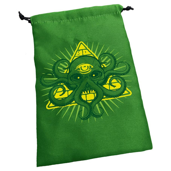 The drawstring bag is made of green fabric, lined with black satin, and holds more than 100 assorted dice! This Cthulhu adorned 6” x 9” bag will be a valuable addition to your next game day, no matter where you play!