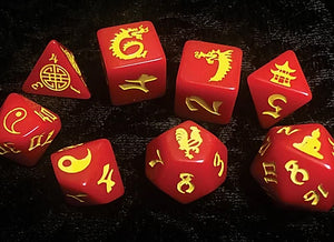 Straight from the Pork-Chop Express! The Double Dragon set features 8 dice (standard RPG set with 2d6s) that are sized up to match well with our 19mm d6s, so they are a handful of dragon goodness! The 2 d6s in the set feature opposing dragon designs. Each of the dice features a design on the max facing (other than the d4) to go with the theme. The d4 features a Chinese lantern design on each side. Be sure to check out the matching Double Dragon dice bag!