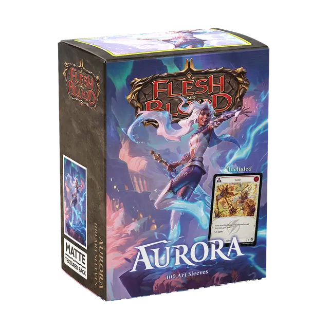 Embue your deck with an essence of electric energy with the Matte Art sleeves featuring Flesh and Blood hero Aurora. Enjoy the supreme shuffle-feel that comes from the textured back of the Matte sleeves. Art sleeves are printed directly onto the sleeve, meaning the artwork is as high-quality and durable as the sleeves they are forged onto.
