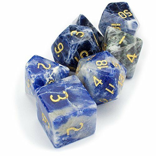 Let's be honest. You may find a lot of loot during a typical campaign, but it isn't quite so often that you find real treasure. These hand-cut, hand-engraved stone polyhedrals, excavated from the very womb of Mother Earth and worked into dazzling terrestrial jewels? These are real treasure. They're the perfect display piece for avid collectors, but still tough enough for regular gameplay (though we do suggest a dice tray). In each set you'll find 7 handcrafted stone polyhedrals in the classic loadout: d4, d6, d8, d10, d00, d12, and d20. And though the dice may come in a set, each piece is its own unique work of art. Every face distinct from the next, featuring the natural striations, layers, and even trapped detritus that characterizes each stone. Additionally, because these dice are hand-cut and hand-engraved, please allow for minor variations in shape and number placement.