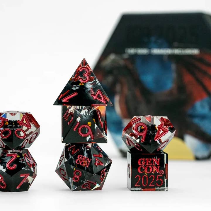 Gen Con dragon inclusion dice have a highly detailed black dragon infused into every die. Handcrafted with sharp edges, this full poly set is unique for any collection. Only thing 1,000 sets made.
