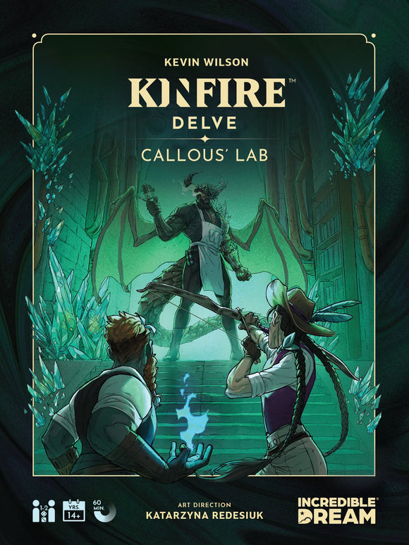 A tactical and cooperative card game for 1-2 players, in Kinfire Delve: Callous' Lab you will fight your way through the Well deck of challenge cards to reach Callous, the Master of the Well, and face them in an epic final battle.