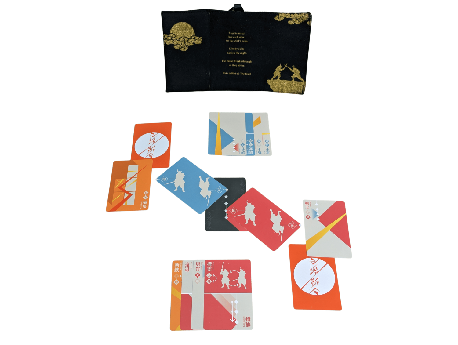 Each player/Samurai has a hand of cards that represent movements, attacks, or special attacks on the battlefield. At the beginning of each round players will place two cards from their hand face down next to the Battlefield and resolve the actions one card at a time. The winner is the player who out-planned their opponent and delivered the decisive strike.