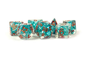 This set is infused with pearls! It’s hard to beat the value in our resin dice sets. Beautiful and affordable, these are great “Critical Reinforcers” to our metal dice. Each 16mm polyhedral set comes with 7 dice (d4, d6, d8, d10, d10 (00-90), d12, and d20).