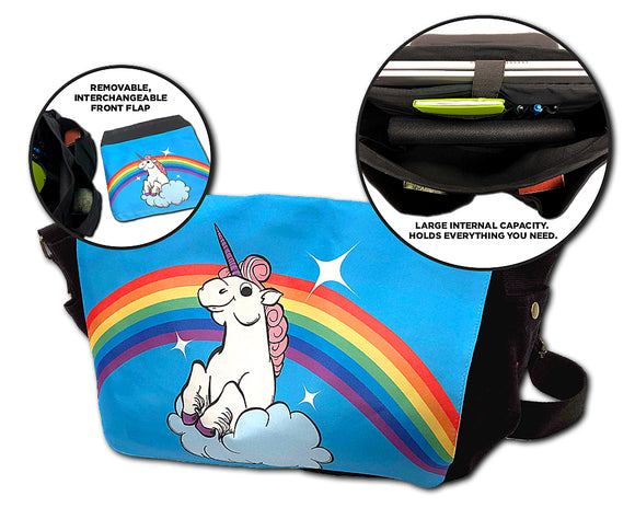Heavy duty cotton canvas messenger bag with removable/interchangeable graphic front flap.