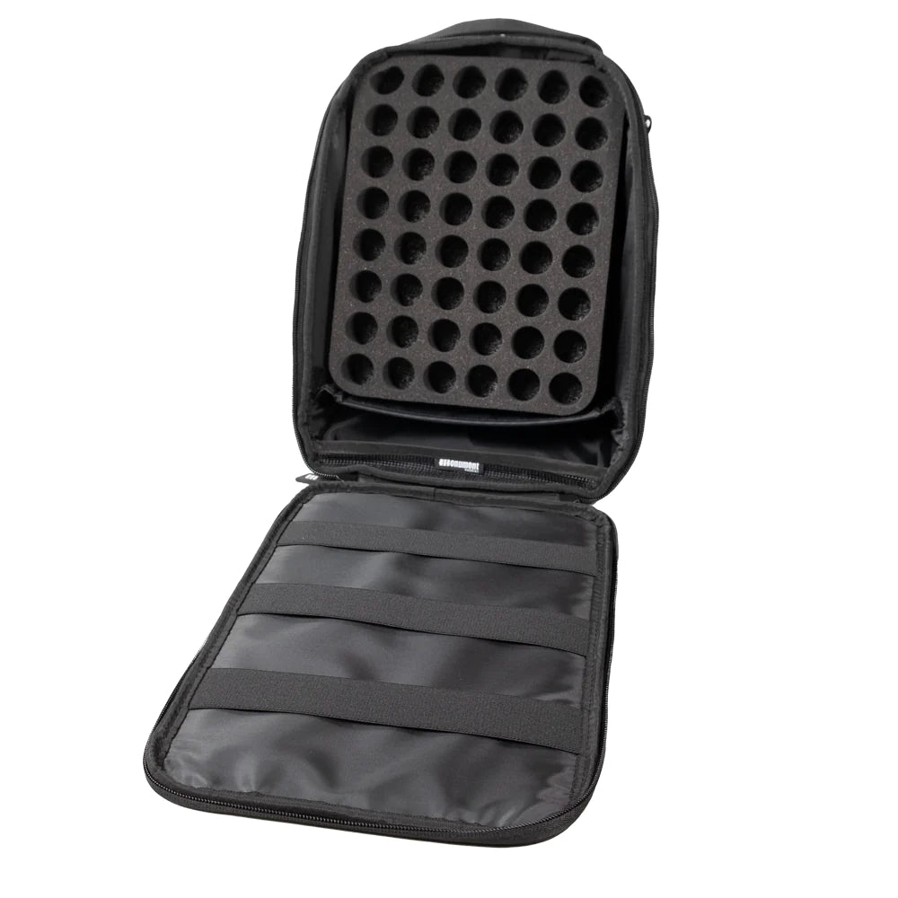 The NEO holds up to 48 paints in our standard foam tray (tray included), along with storage below the paints for brushes and tools, and a large compartment in the back for more accessories, mediums, palettes, etc. The front lid has elastic bands for holding your palette securely and acts as your work suface when the bag is open for use.