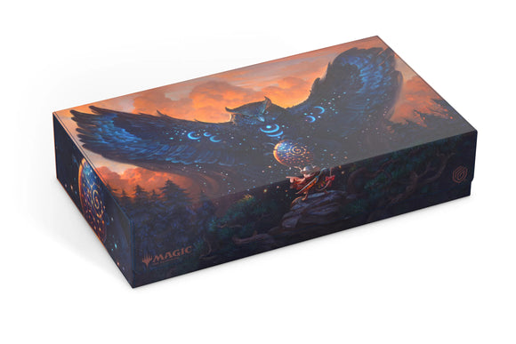 The Omnihive 1000+ Xenoskin from the "Bloomurrow" series captures all the charm of Magic: The Gathering's new fairytale world: Featuring the officially licensed artwork Dawn's Truce by Justin Gerard, the breathtaking Omnihive is designed to hold multiple deck boxes, dice and/or play-mats at once with the help of two flexibly positioned magnetic trays. The Omnihive made of the popular Xenoskin material is also the perfect choice for storing a larger collection of individual cards (up to 1000 double-sleeved) or a cube. Elements of Justin Gerard's masterpiece are also reflected on the elegant microfiber inner lining, while a strong magnetic closure with additional ZnapClaw mechanism ensures that cards and deck boxes are safe inside the box.