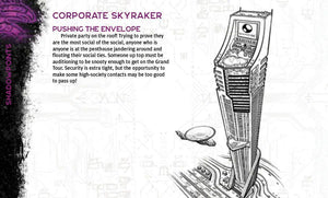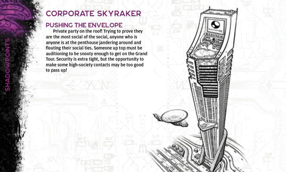 Shadow Points features thirty such locations on handy cards, with an illustration to provide the basic look of each building, along with information entrances and exits, security profile, people who might be present, special features, and fun ways to use the location in your game. These can be dropped into any city where the gamemaster needs them to keep the game moving.