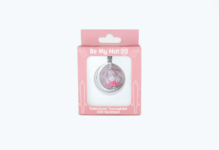 The "Be My Nat 20" D20 Necklace is a must-have accessory for tabletop game aficionados! This enchanting necklace showcases a crescent moon pendant embracing a 22mm Snowglobe D20 that spins freely and can be effortlessly detached for precision rolling. The D20 is expertly designed with sharp edges, guaranteeing those game-changing Nat 20 rolls. Spin the die and watch as heart-shaped glitter dances in a mesmerizing cascade of red.