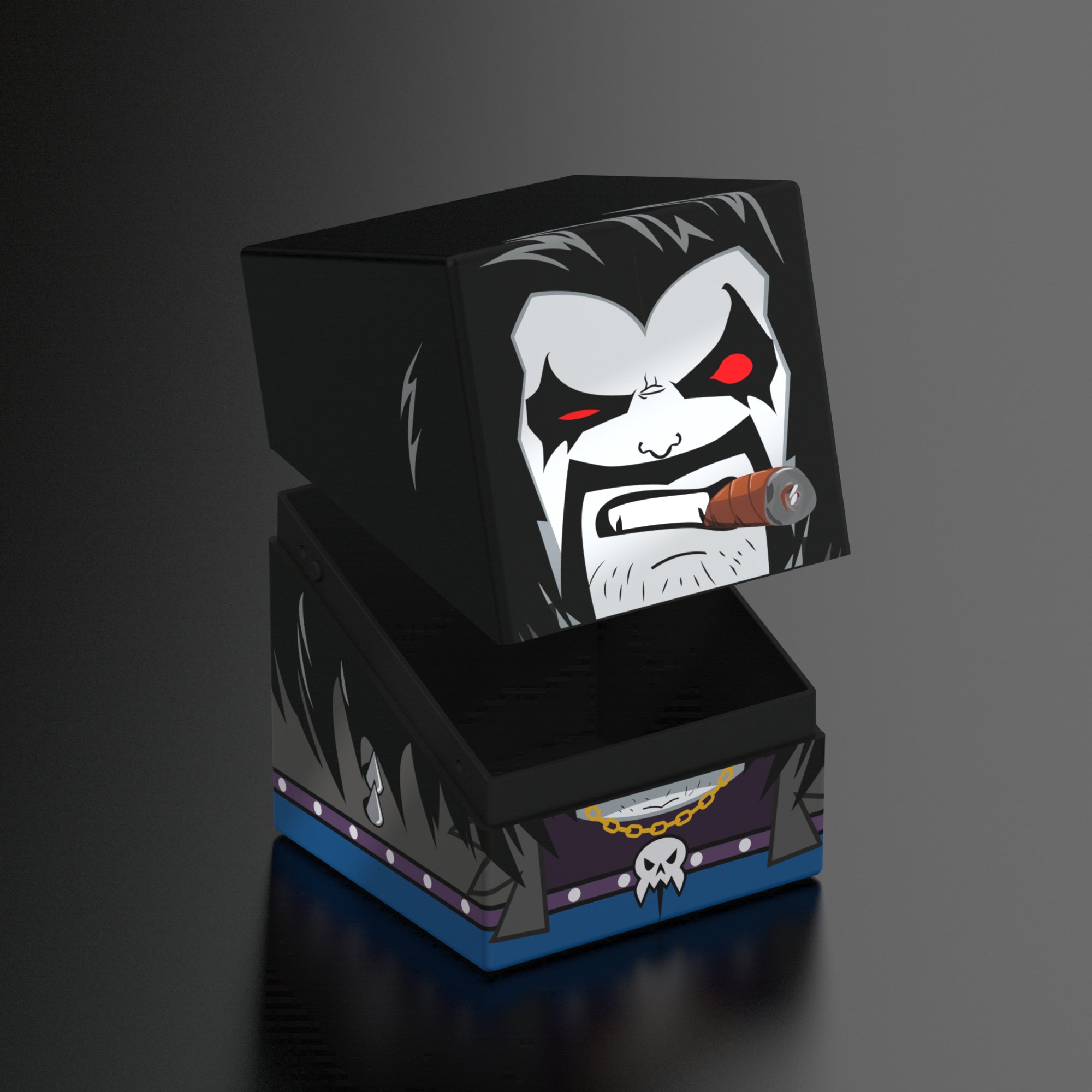 Collectible box for storing TCG decks, tabletop gaming accessories, and/or collectibles. The Lobo™ Squaroe from the DC Justice League™ edition holds up to 100 cards in double protective sleeves if used as a deck box. Squaroes are made from 78% renewable resources.