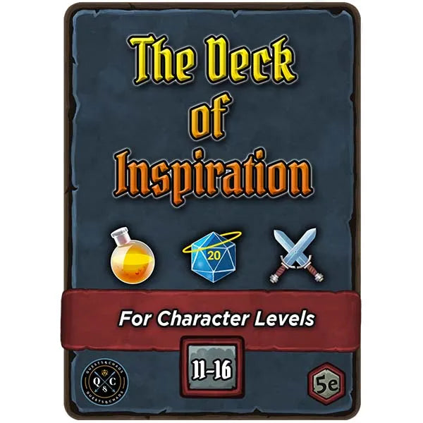 The Deck of Inspiration is designed to enhance the inspiration mechanic of Dungeons & Dragons 5e. The deck provides the DM with unique and fun one-time use boons to reward great player behavior. This deck contains 55 cards covering three types of boons, Divine Inspiration, Potions, and one-time use Magic Items.